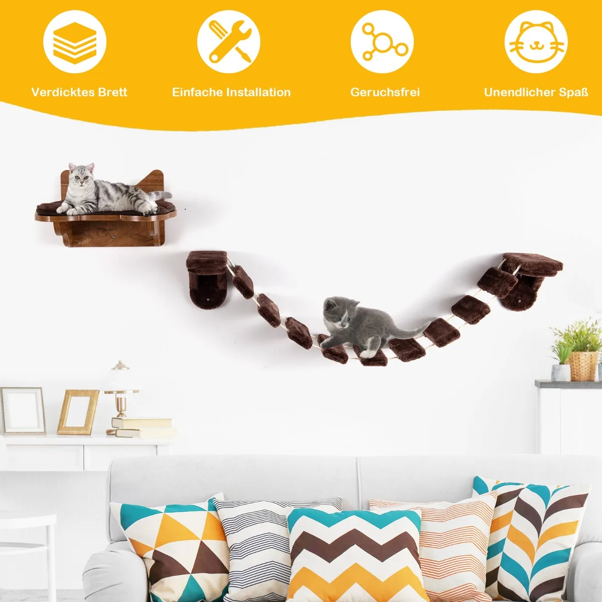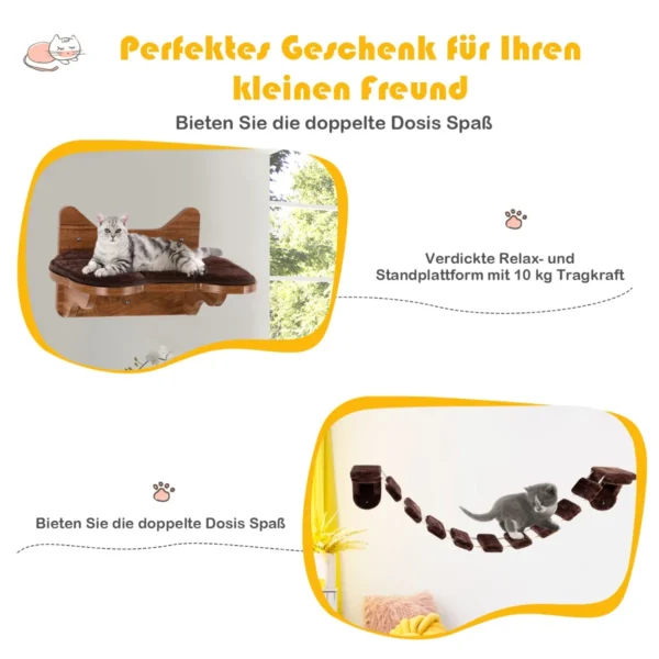 Laipiojimo sienelė katėms iš 2 dalių rudos spalvos yra funkcionalus ir patogus sprendimas katės aktyviam laisvalaikiui. Komplekte dera patvari laipiojimo kopėčių sistema ir patogi katės lova, skirta poilsiui. Tvirtas montavimas prie sienos padeda taupyti erdvę ir užtikrina saugumą.