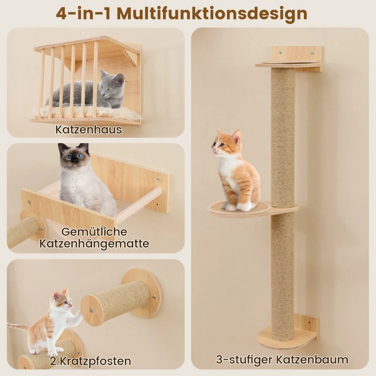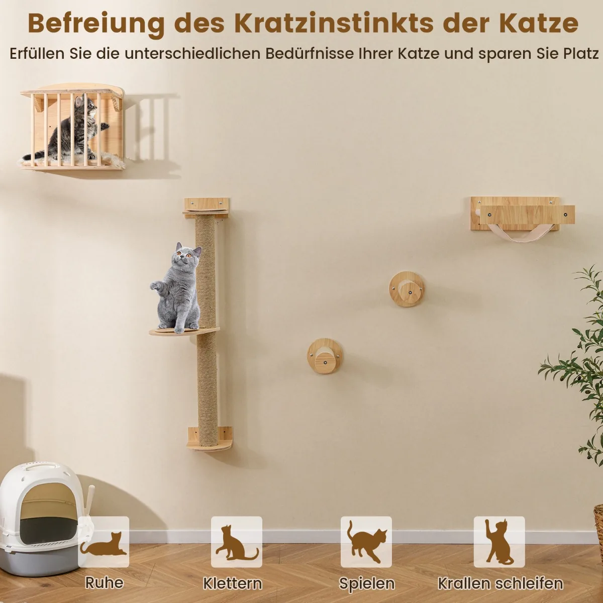 - 4 viename daugiafunkcis kačių laipiojimo rinkinys, leidžiantis katėms laipioti, žaisti, ilsėtis ir kasytis.