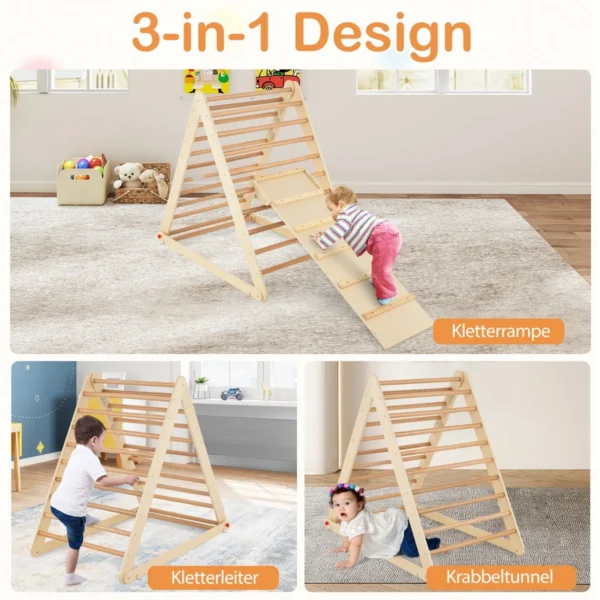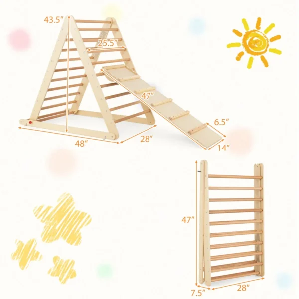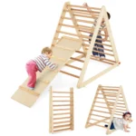 Laipiojimo trikampis su čiuožykla 120x71x110 cm, šviesiai rudos spalvos, yra funkcionalus vaikų laisvalaikio žaislas, skirtas lavinti motorinius įgūdžius ir pusiausvyrą. Pagamintas iš natūralios medienos su tvirtais metaliniais jungtimis, šis trikampis užtikrina saugų ir linksmą žaidimą įvairaus amžiaus vaikams.