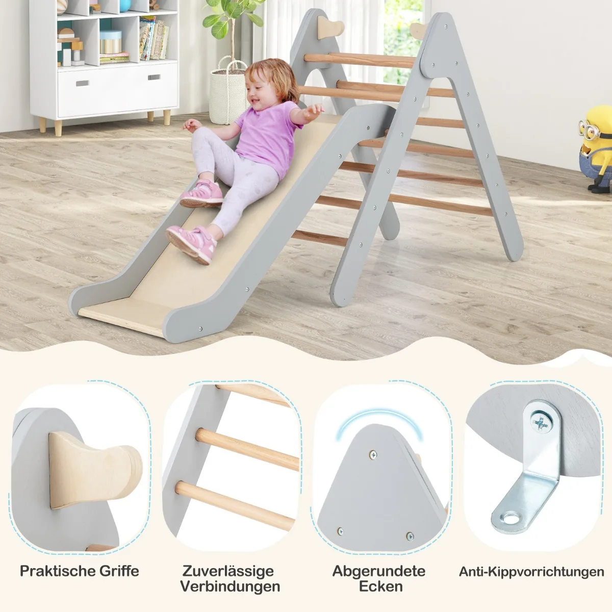 Laipiojimo trikampis su čiuožykla šviesiai rudos ir pilkos spalvos yra universalus vaikų žaidimo įrenginys, skirtas lavinti motoriką, pusiausvyrą ir koordinaciją. Šis medinis žaislas puikiai tinka vaikų kambariams, žaidimų erdvėms ar darželio aplinkai.
