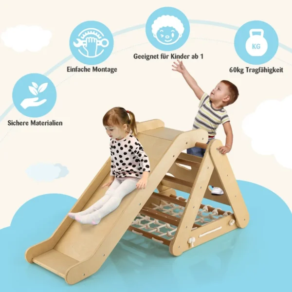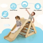 Laipiojimo trikampis su čiuožykla, šviesiai rudos spalvos, yra universalus žaislas vaikams, skatinantis fizinį aktyvumą ir motorikos vystymąsi. Pagamintas iš natūralaus medžio masyvo, jis tinkamas naudoti tiek patalpose, tiek lauke. Tobulas pasirinkimas vaikų kambariui, sodui ar žaidimų aikštelei.