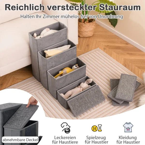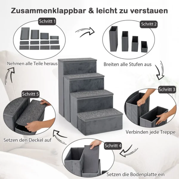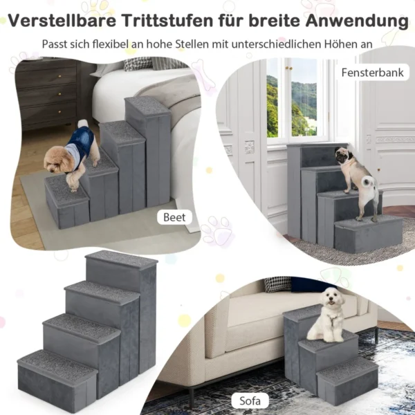 Laiptai gyvūnams 65x38x58cm, pilkos spalvos, padeda mažiems ir vidutinio dydžio šunims lengviau pasiekti aukštus paviršius, tokius kaip lovos, sofos ar palangės. Keturi pakopų laiptai su neslystančiu paviršiumi užtikrina saugumą ir patogumą kasdienėje naudojimo vietoje.