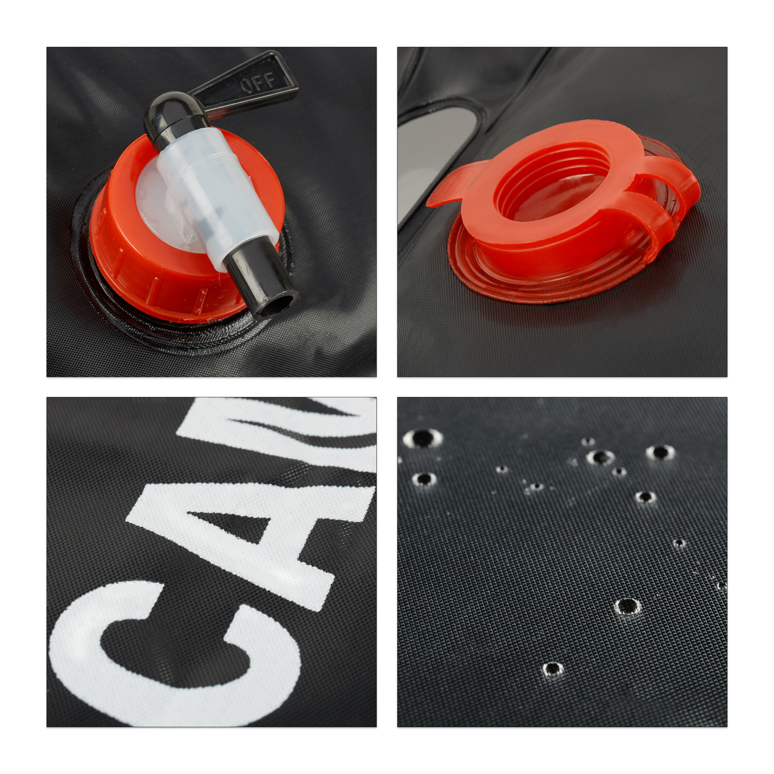 - Medžiaga: Juodas PVC, kuris greitai įkaista saulėje, leidžiantis mėgautis šiltu dušu.