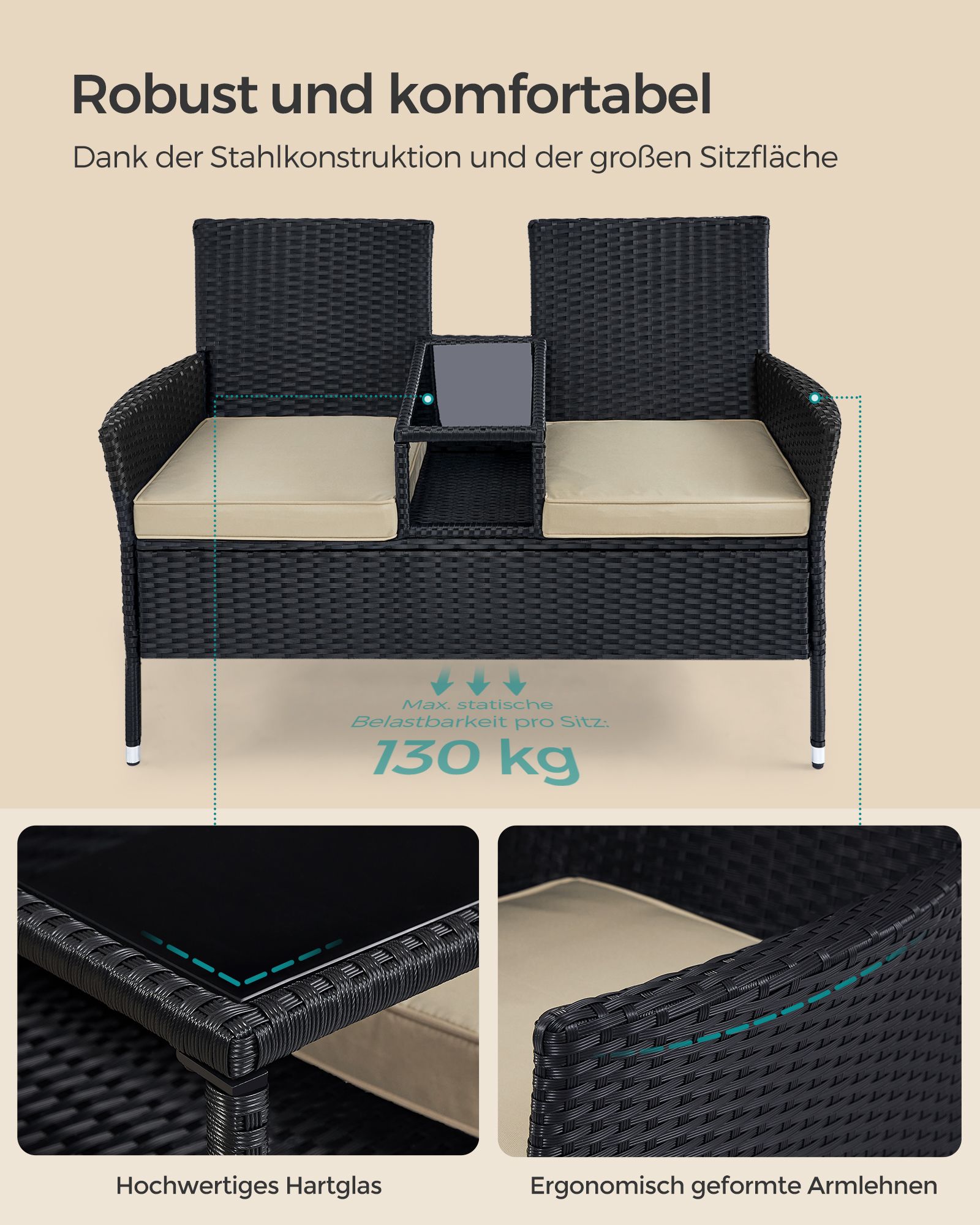 Šis fotelis yra pagamintas iš tvirtų ir ilgaamžių medžiagų, kurios užtikrina jo atsparumą įvairioms oro sąlygoms. Plieninė konstrukcija suteikia stabilumo, o PE polietileno ir poliesterio derinys užtikrina patogumą ir lengvą priežiūrą. Grūdintas stiklas suteikia papildomo elegancijos pojūčio.