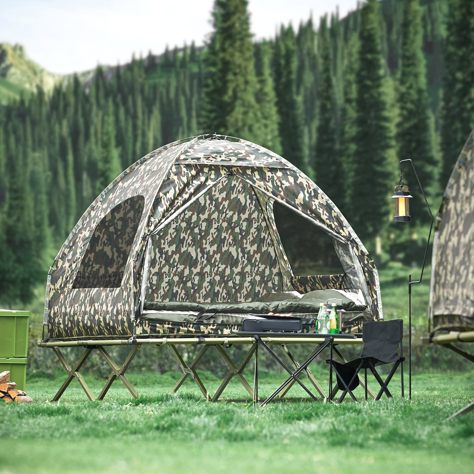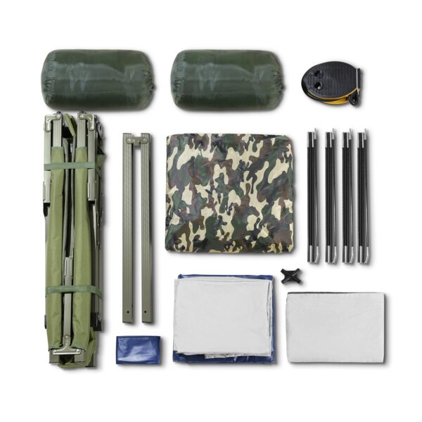 Palapinės pakelta konstrukcija užtikrina apsaugą nuo drėgnos ir šaltos žemės, todėl visada būsite sausi ir šilti. Komplektą sudaro palapinė, pripučiama čiužinys ir dvivietė lauko gultas, kurie lengvai ir greitai surenkami, suteikiant daugiau laiko mėgautis stovyklavimo patirtimi.