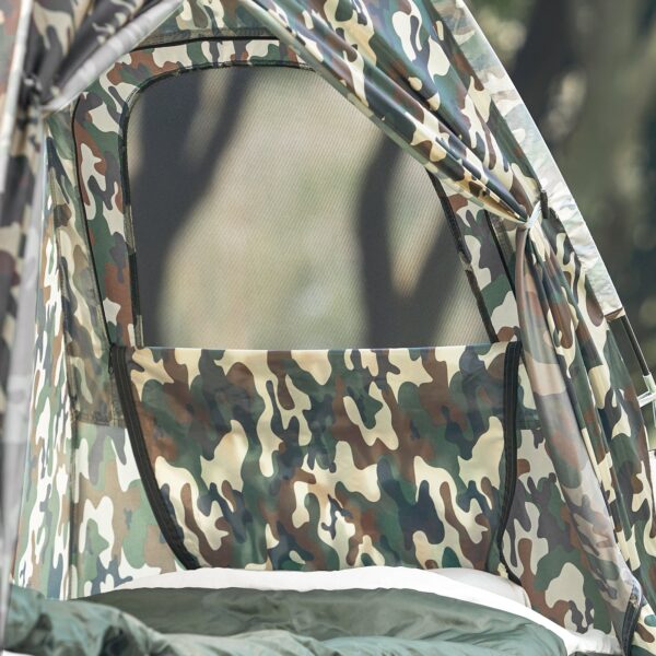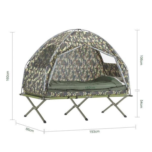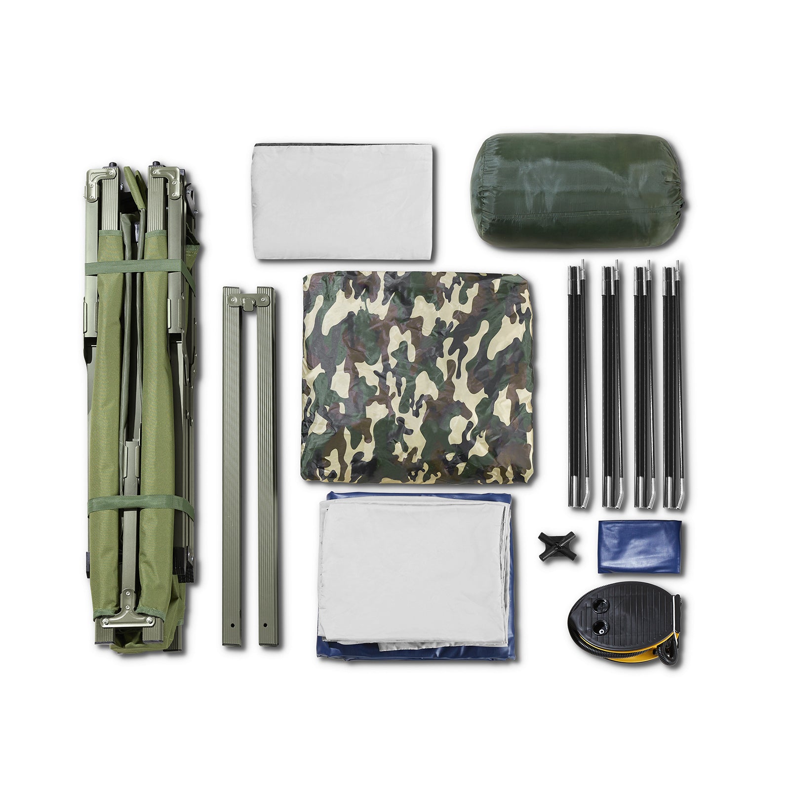 Unikali pakelta konstrukcija užtikrina, kad būsite apsaugoti nuo drėgnos ir šaltos žemės, todėl visada jausitės sausai ir šiltai. Komplektą sudaro palapinė, pripučiama čiužinys ir vienvietė lauko gultas, kurie yra lengvai ir greitai surenkami, suteikiant daugiau laiko mėgautis poilsiu.