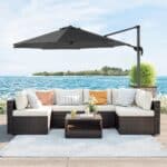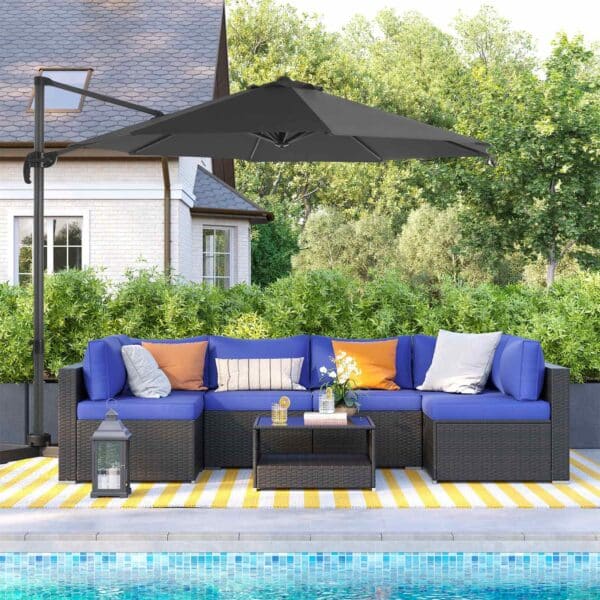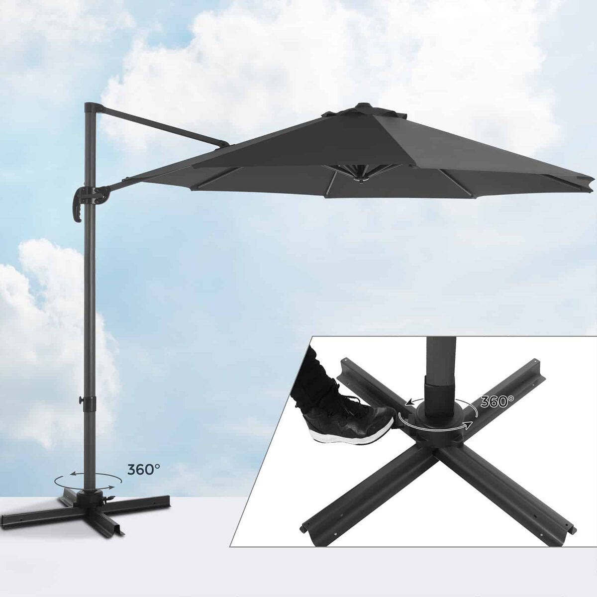 Mielai praleiskite visą sekmadienį balkone skaitydami gerą knygą, kad atsipalaiduotumėte ir pabėgtumėte nuo kasdienio gyvenimo streso. Ne visada turite perkelti skėtį, kad liktumėte šešėlyje! Užlipkite ant pedalo ir pasukite skėčio kotą taip, kad skėtis būtų nukreiptas kita kryptimi. Šonine rankena reguliuokite skėčio pasvirimo kampą saulei tekant.