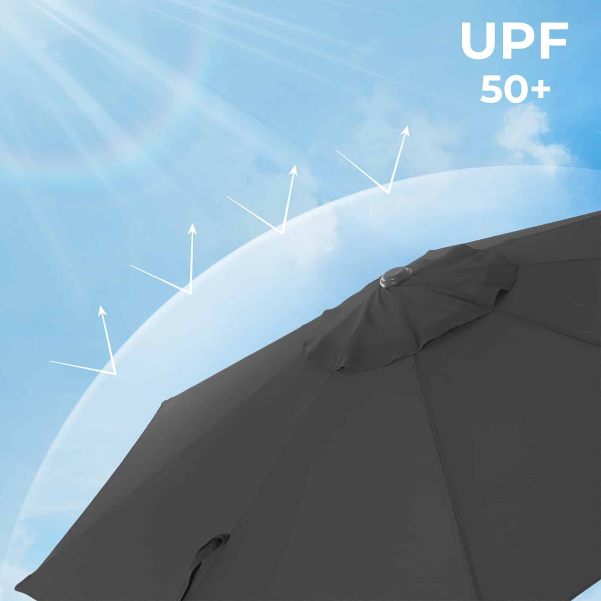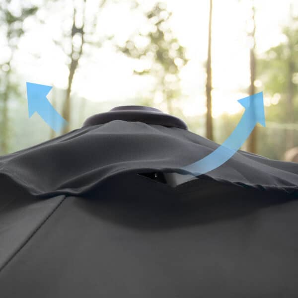 Norite pasnausti sode, pavalgyti su draugais terasoje ar pasimėgauti kavos pertraukėle su šeima gryname ore, bet bijote atšiaurių saulės spindulių? Viskas, ko jums reikia, yra šis skėtis! Mūsų skėtis pagamintas iš 200 g/m² poliesterio audinio ir siūlo puikią UV apsaugą iki UPF 50+. Taigi nereikės jaudintis, kad ryški šviesa pakenks akims ir paraus oda.