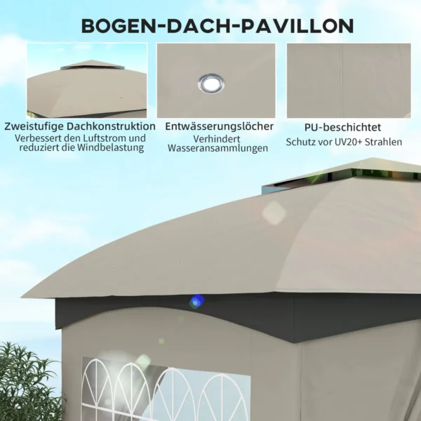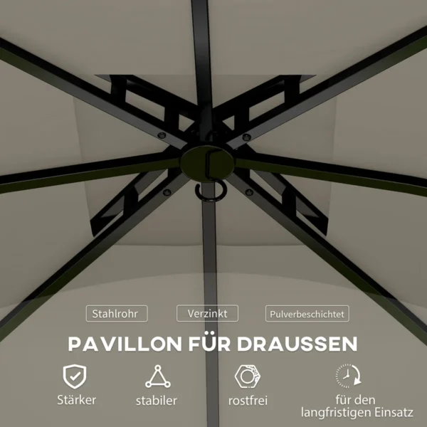 Patirk gamtos magiją elegantiškame Outsunny paviljone. Su neplyštančiu stogu, kuris apsaugo nuo saulės ir stilingais, permatomais arkiniais langais, ši pavėsinė ne tik traukia akį, bet ir labai praktiška. Tvirtas, milteliniu būdu dengtas metalinis karkasas ir novatoriška dviejų pakopų stogo konstrukcija užtikrina optimalią oro cirkuliaciją ir apsaugo jus nuo stichijų – puikiai tinka terasai, sodui ir kitoms lauko erdvėms.