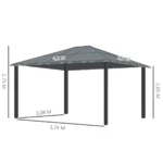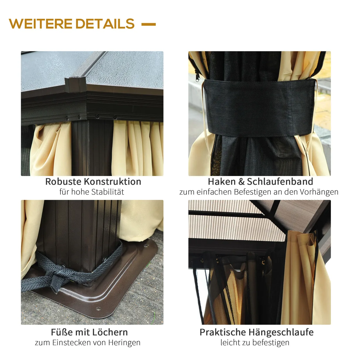 Panerkite į gryną lauko prabangą su mūsų išskirtine Outsunny pavėsine kietu stogu. Permatomas polikarbonatinis stogas sukuria patogią, kviečiančią atmosferą atsipalaiduoti. Tuo pačiu paviljonas su dvisluoksnėmis užuolaidomis užtikrina patikimą apsaugą nuo nepalankių oro sąlygų ir erzinančių vabzdžių. Dėl naudojamų tvirtų ir oro sąlygoms atsparių medžiagų šis aliuminio paviljonas yra ilgaamžiškumo ir patikimumo šedevras.