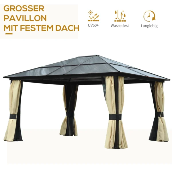 - ✔ Permatomas, vandeniui atsparus paviljono stogas pagamintas iš UV spinduliams atsparaus polikarbonato, aliuminio ir aukštos kokybės polikarbonato rėmas