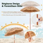 Lauko skėtis 175x194cm, rudos spalvos, skirtas suteikti atogrąžų atmosferą jūsų sodui, terasai ar paplūdimiui. Šis aukštos kokybės paplūdimio skėtis su šiaudiniu tamsiu stogu apsaugo nuo saulės ir yra lengvai reguliuojamas pagal saulės padėtį. Universalus dizainas ir patogus sulankstymas leidžia jį lengvai transportuoti ir naudoti įvairiose lauko erdvėse.