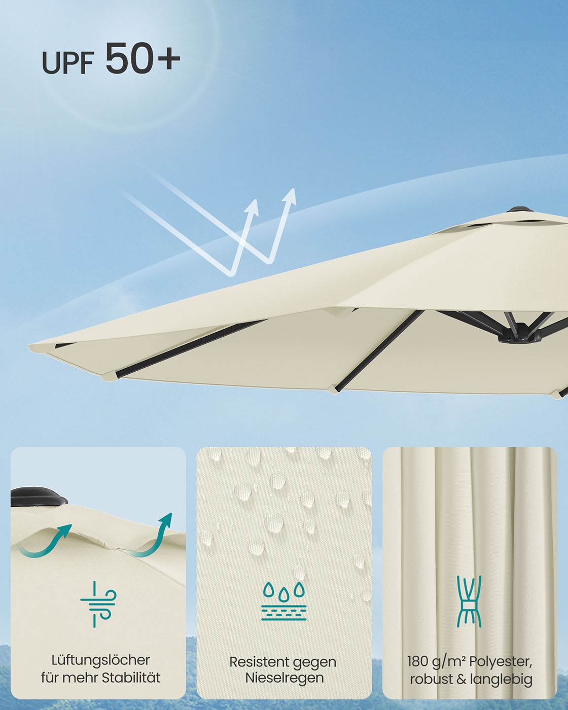 Skėtis pagamintas iš tvirto metalo, o jo audinys – iš 180 g/m² poliesterio, kuris yra atsparus oro sąlygoms. Skėčio aukštis siekia 223 cm, o audinio dydis yra 394 x 200 cm (ilgis x plotis).