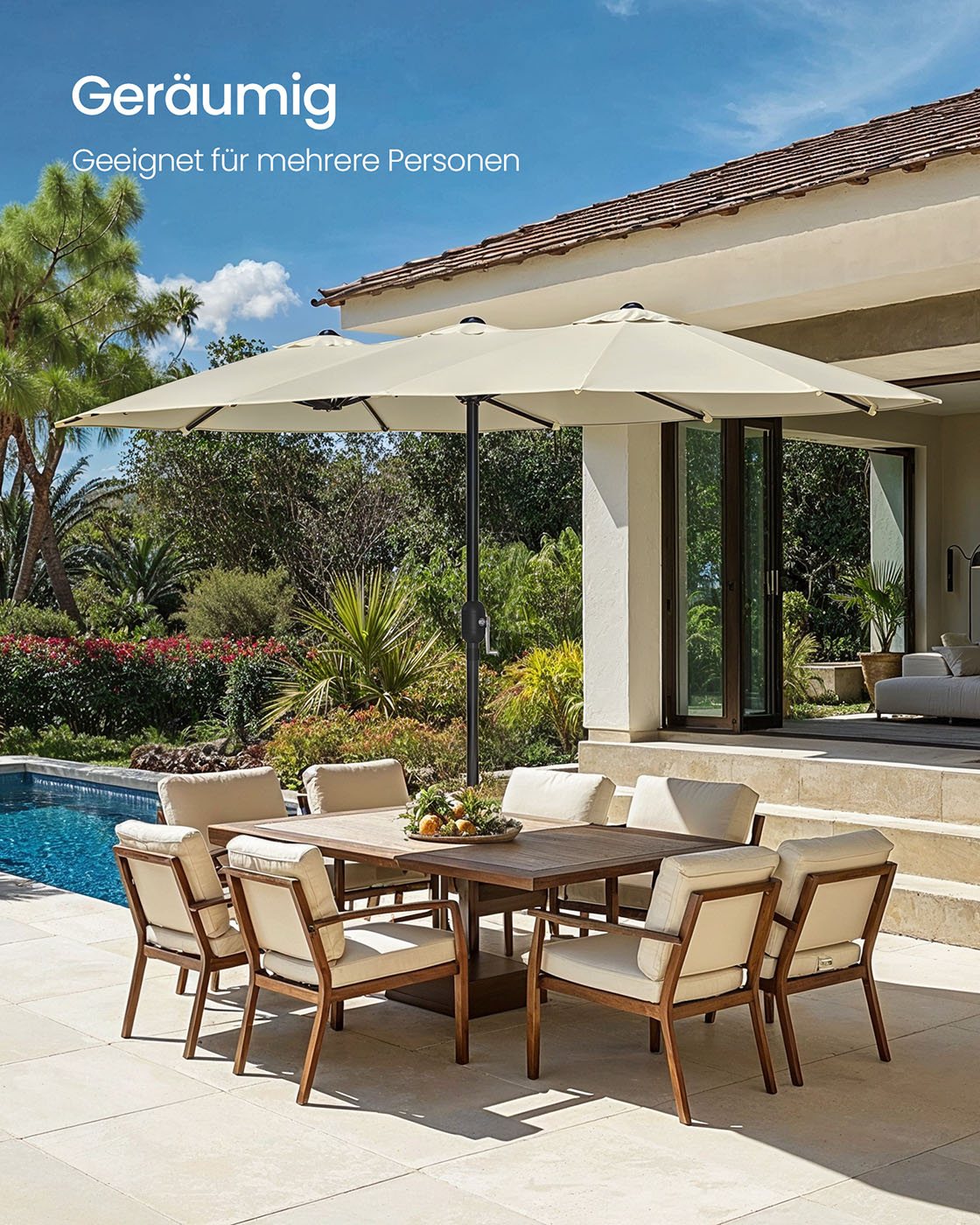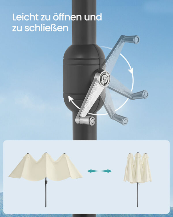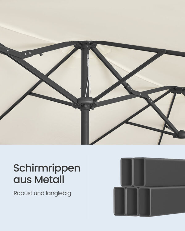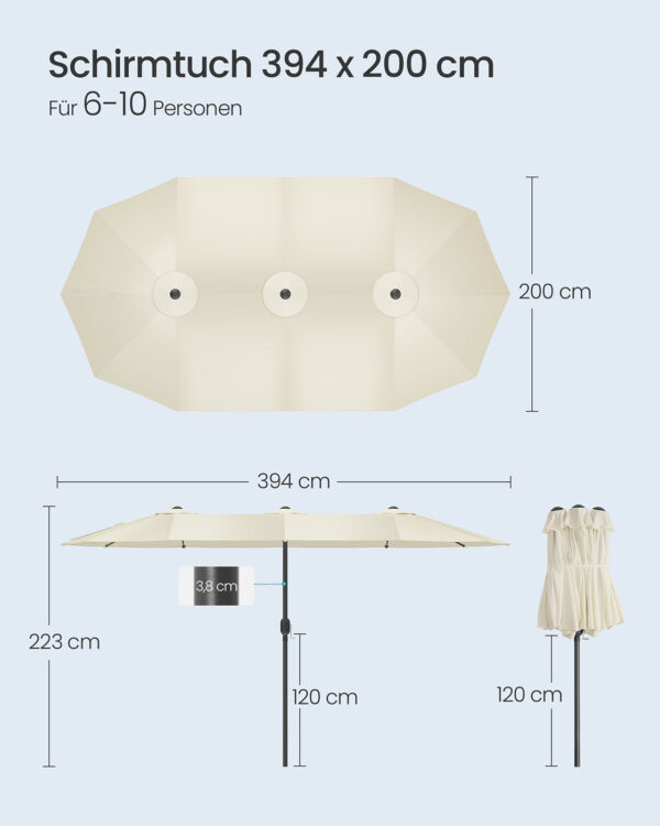 Šis lauko skėtis 200×394 cm, smėlio ir juodos spalvos, yra puikus pasirinkimas jūsų terasai ar sodui. Jo elegantiškas dizainas ir kokybiškos medžiagos užtikrina ilgaamžiškumą ir stilių.