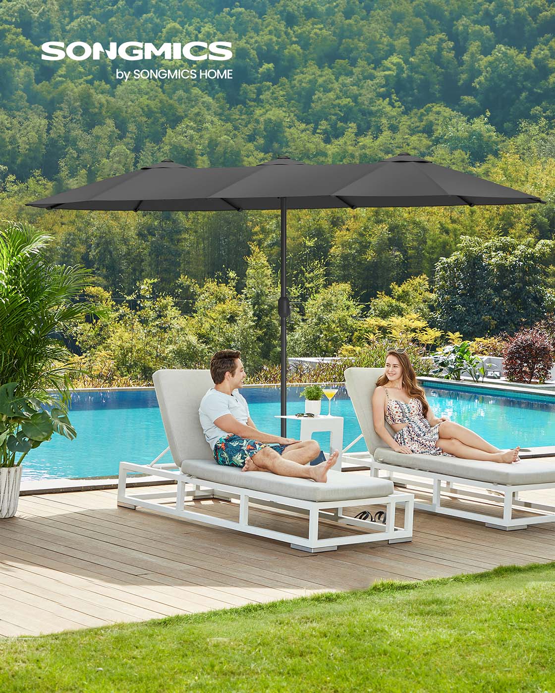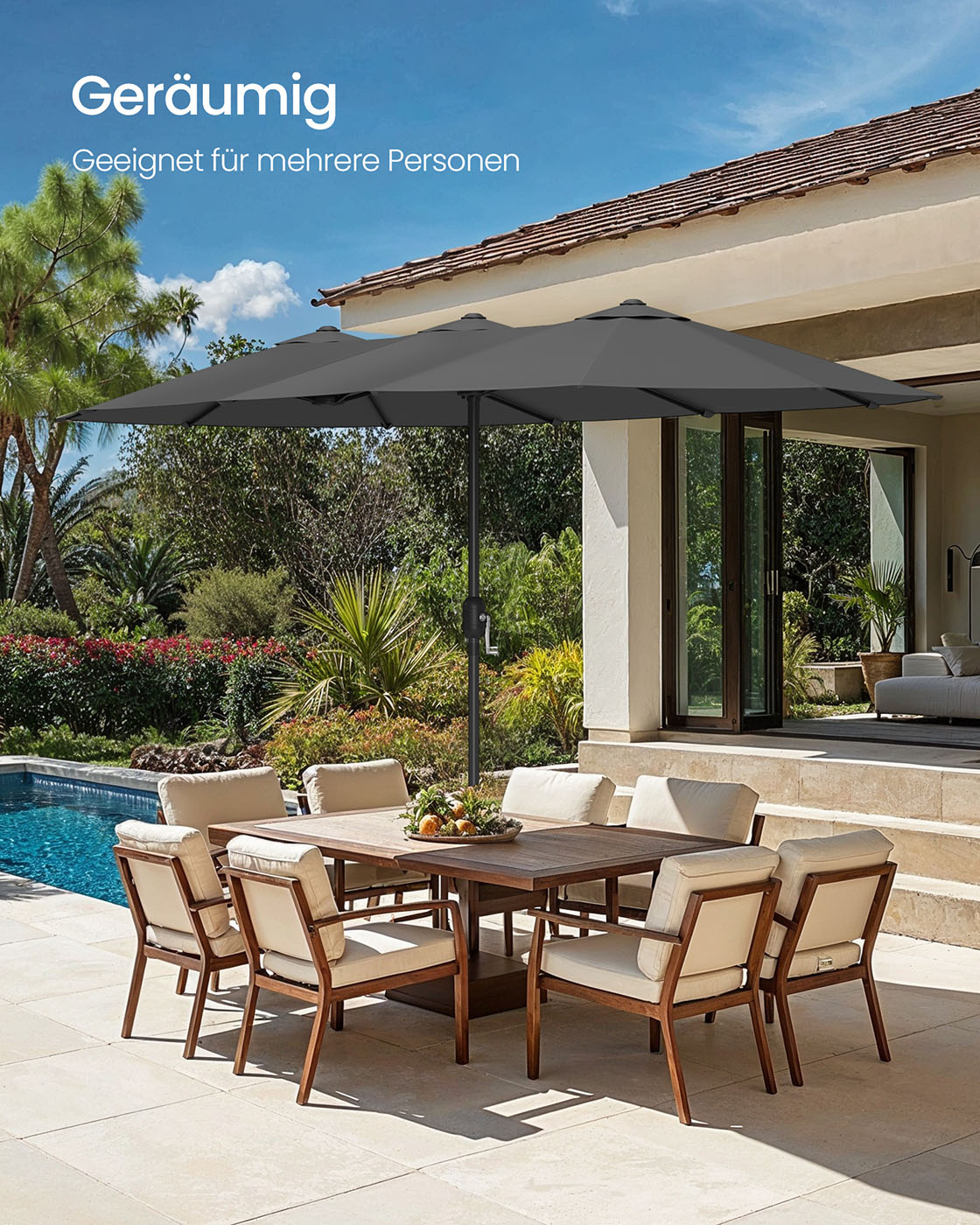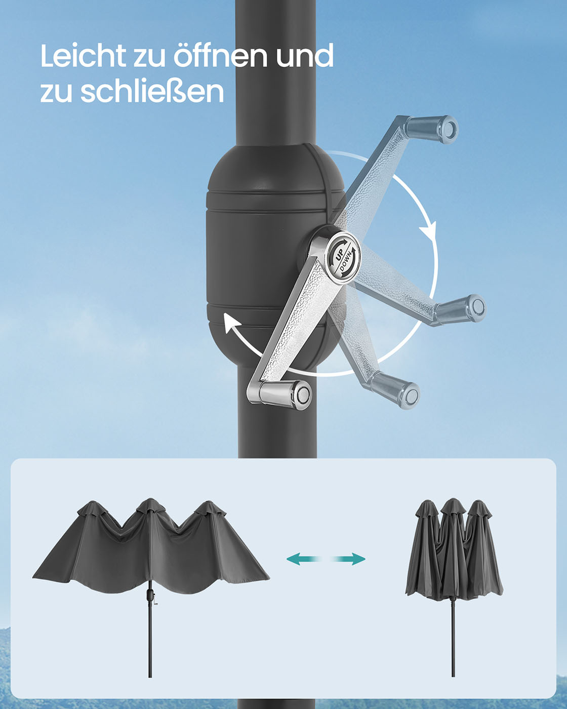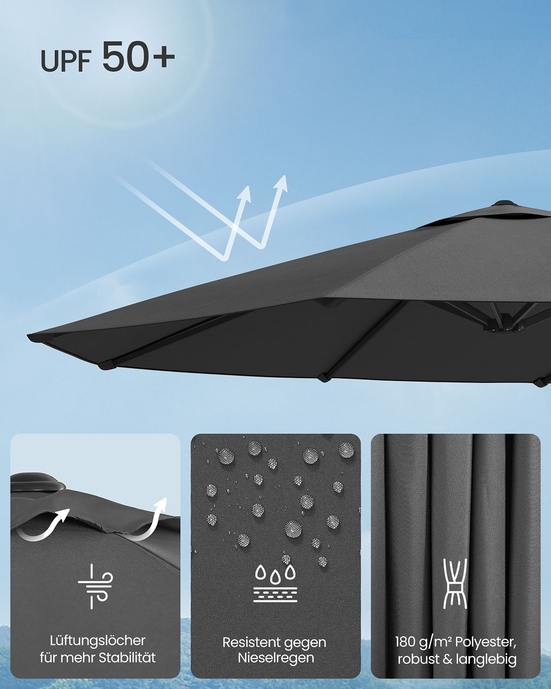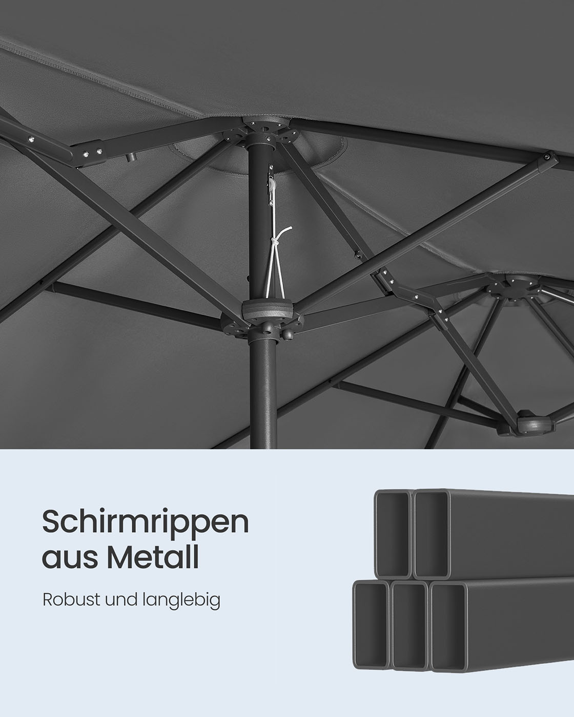 Šis lauko skėtis, kurio matmenys yra 200 x 394 cm, yra puikus pasirinkimas jūsų terasai ar sodui. Tamsiai pilkos ir juodos spalvos derinys suteikia modernumo ir elegancijos jūsų lauko erdvei.