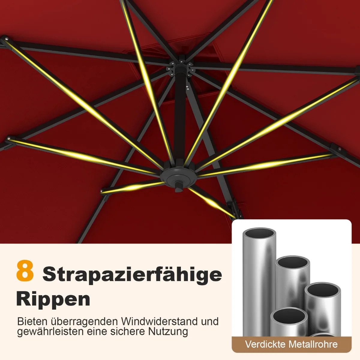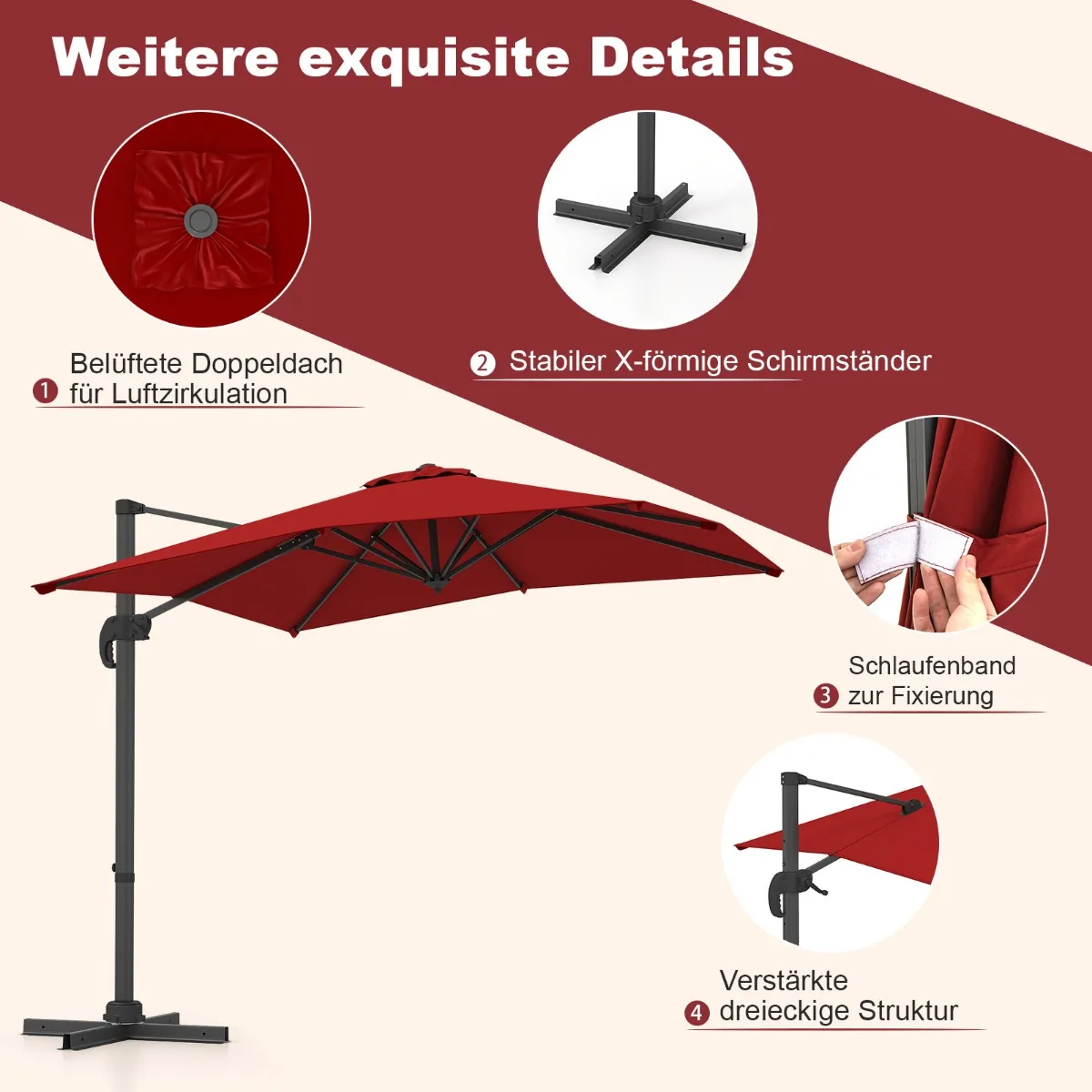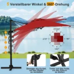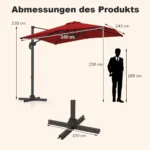 Lauko skėtis 245x245x238cm, raudonos/juodos spalvos, skirtas patikimai apsaugai nuo saulės lauke. Reguliuojamas konsolinis skėtis tinka naudoti baseinuose, terasose bei soduose. Skėtis pasižymi patogia 360° pasukimo funkcija ir atsparumu blukimui.