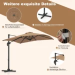 - Reguliuojamas konsolinis lauko skėtis su 5 pasvirimo kampais ir 360° pasukimu per kojinį pedalą.