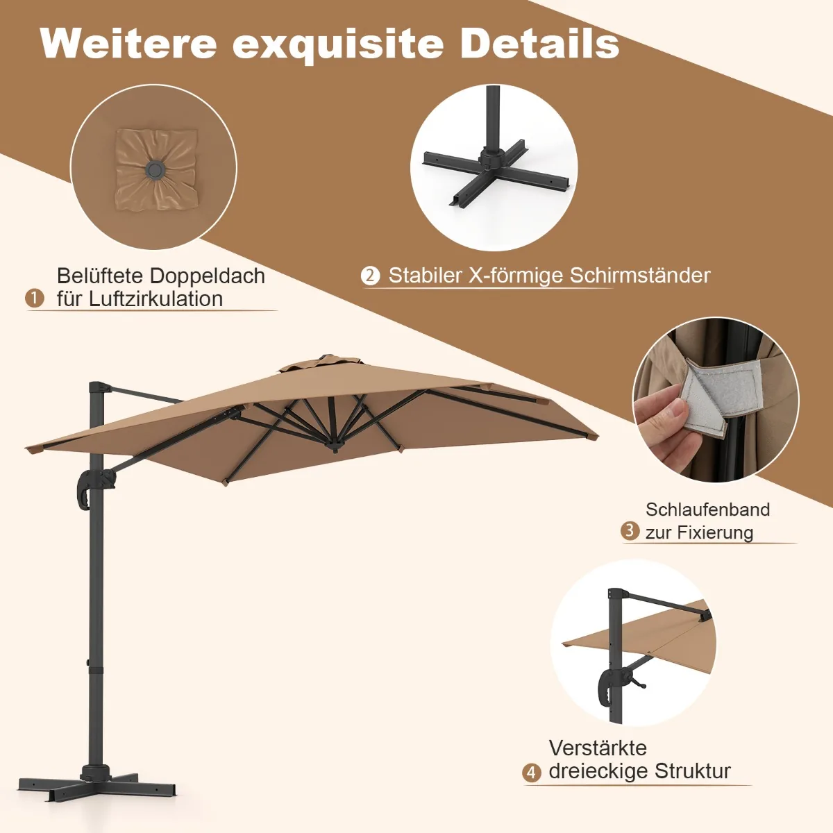Lauko skėtis 245x245x238cm, rudos ir juodos spalvos, skirtas efektyviai apsaugai nuo saulės terasose, soduose ar baseinų zonose. Reguliuojamas konsolinis modelis lengvai pritaikomas pagal individualius poreikius, užtikrinant plačią pavėsio zoną lauke.