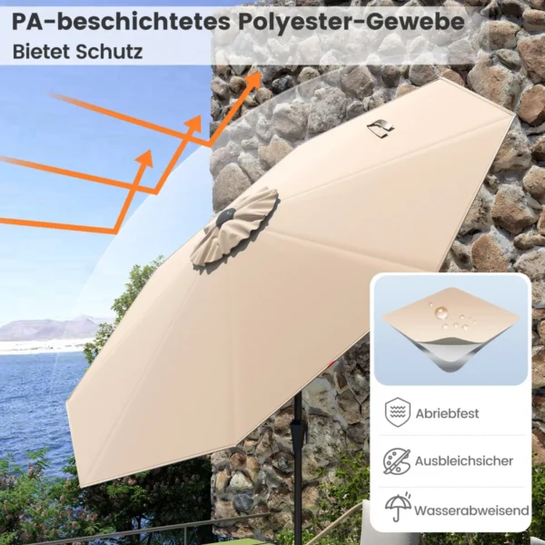 Lauko skėtis 270×240 cm, šviesiai rudos ir juodos spalvos, skirtas patikimai apsaugai nuo saulės terasose, kiemuose ar soduose. Patvarus PA dengto poliesterio audinio stogelis ir tvirta metalinė konstrukcija užtikrina ilgalaikį naudojimą lauko sąlygomis.