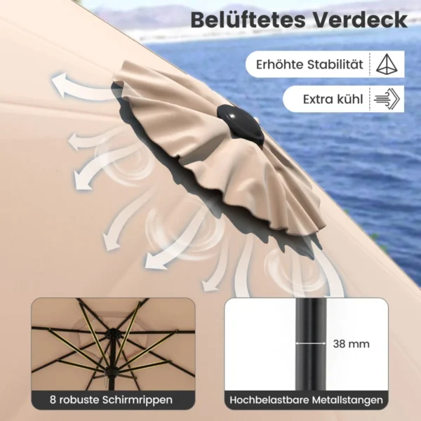- Vėdinamas stogelis užtikrina oro cirkuliaciją ir vėsų mikroklimatą po skėčiu.