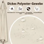 Lauko skėtis 270x248cm smėlio spalvos yra praktiškas sprendimas apsisaugoti nuo saulės kieme, sode ar kitose lauko erdvėse. Didelis skėčio plotis užtikrina pakankamai šešėlio dviem kėdėms ir stalui, o lengvas jo valdymas padeda greitai atidaryti, uždaryti ir reguliuoti skėčio poziciją pagal saulės padėtį.