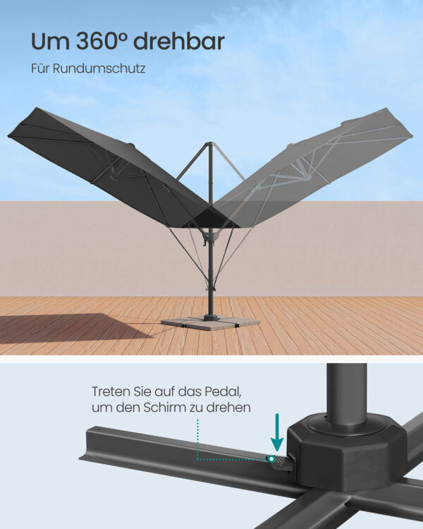 Skėtis sveria 17,4 kg, todėl yra stabilus ir lengvai valdomas. Tai puikus sprendimas apsaugai nuo saulės ir lietaus jūsų lauko erdvėje.