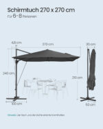 Šis lauko skėtis 270×270 cm yra puikus pasirinkimas jūsų terasai ar sodui. Tamsiai pilkos ir juodos spalvos derinys suteikia modernumo ir elegancijos jūsų lauko erdvei.