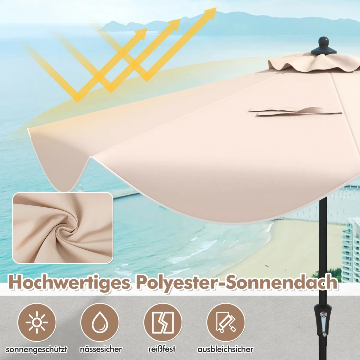 Lauko skėtis 280x245cm, smėlio ir juodos spalvos, puikiai tinka sodui ar terasai. Skėtis suteikia didelį šešėlį ir apsaugo nuo tiesioginių saulės spindulių įvairioms lauko veikloms. Poliestero stogelis su ventiliacija užtikrina oro cirkuliaciją ir patogumą karštomis dienomis.