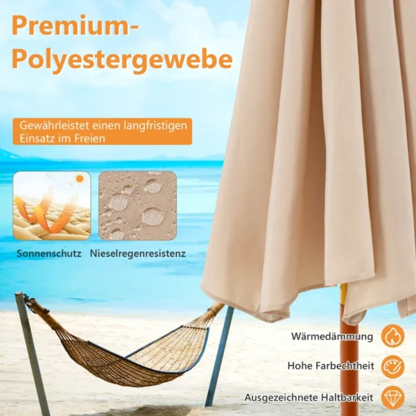 Lauko skėtis 283×252,5 cm, smėlio ir rudos spalvos, suteikia patogų pavėsį terasoms, sodams ar kiemams. Skėtis turi medžio grūdų stulpą bei poliesterio audinio baldakimą, kuris pritaikytas atsparumui saulės spinduliams ir vėjo poveikiui. Lengvas reguliavimo mechanizmas leidžia greitai ir patogiai valdyti skėčio padėtį.