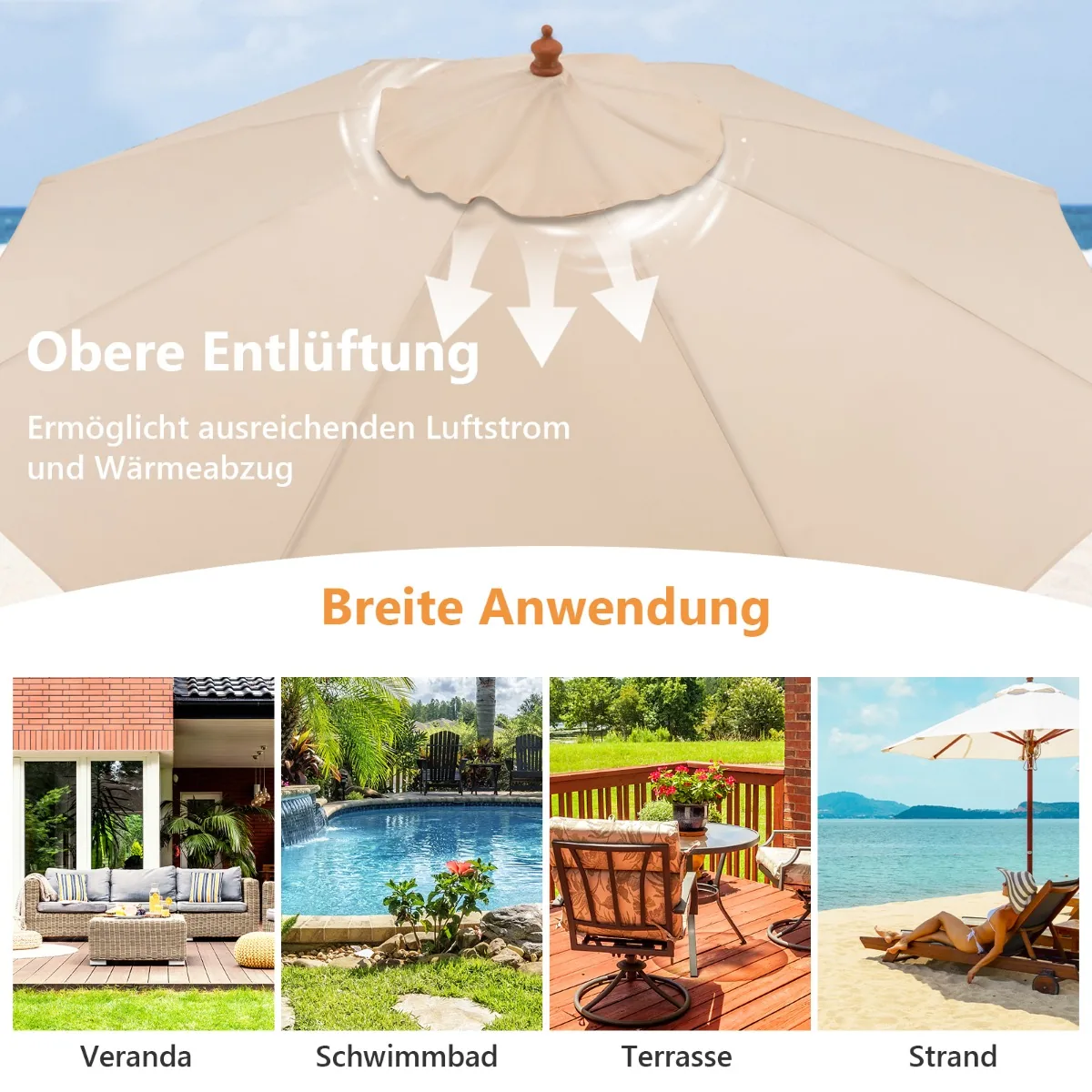 - Skėtis skirtas lauko terasoms, sodams ir kiemams, su dideliu 283 cm skersmeniu suteikia efektyvią apsaugą nuo saulės.