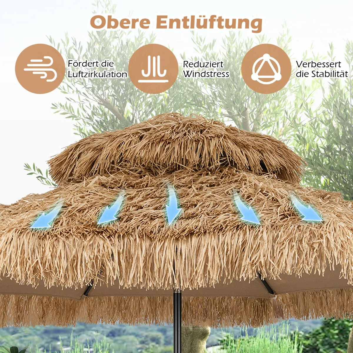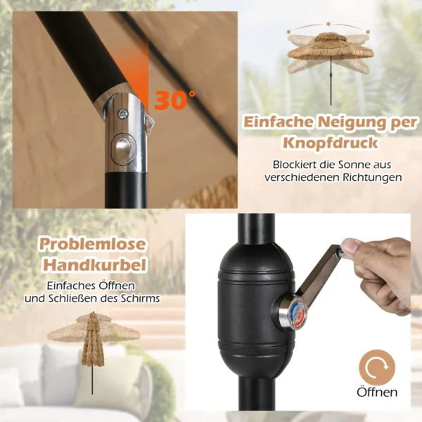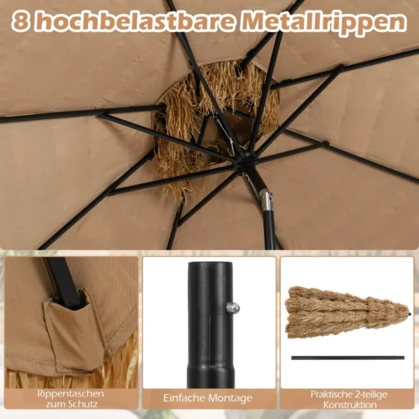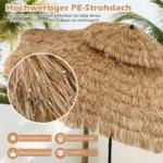 Lauko skėtis 299×270 cm, rudos ir juodos spalvos, sukurs atogrąžų atmosferą jūsų kieme ar sode. Šis šiaudinis tiki stiliaus skėtis puikiai tinka saulės apsaugai lauko erdvėse, užtikrinant komfortišką poilsį ir šešėlį.