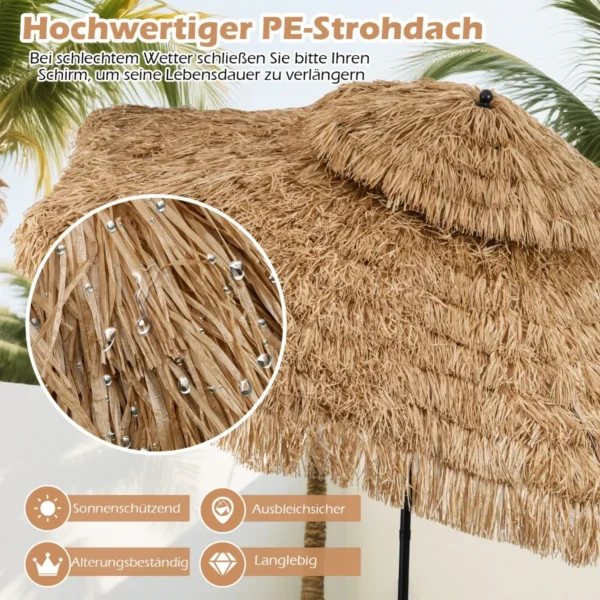 - Skėtis su šiaudine tiki danga atkuria Havajų paplūdimio nuotaiką.