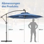 Lauko skėtis 300x245cm mėlynos ir juodos spalvos suteiks jūsų terasai ar sodui efektyvią apsaugą nuo saulės. Konsolinis dizainas ir 360° sukimo funkcija leidžia lengvai reguliuoti šešėlio kampą, o saulės baterija maitinamas LED apšvietimas užtikrina ilgesnį naudojimą vakare.