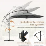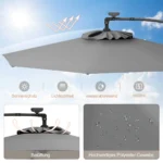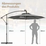 Lauko skėtis 300×245 cm pilkos ir juodos spalvos puikiai tinka sukuriant šešėlinę zoną lauke. Konsolinis skėtis su saulės baterija maitinamu LED apšvietimu užtikrina komfortą ir apsaugą nuo saulės įvairiomis oro sąlygomis.