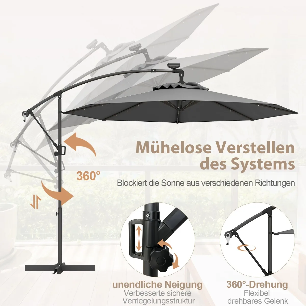 - Didelis šešėlio plotas – 7 m², lengvai reguliuojamas nuo kampo pasvirimo iki 360° sukimosi.
