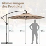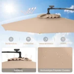 Lauko skėtis 300x245cm, rudos ir juodos spalvos, skirtas užtikrinti patogią šešėlinę zoną jūsų lauko teritorijoje. Konsolinis skėtis turi integruotą saulės baterija maitinamą LED apšvietimą ir pritaikytą reguliavimo mechanizmą, leidžiantį optimaliai apsisaugoti nuo saulės bet kokiomis oro sąlygomis.
