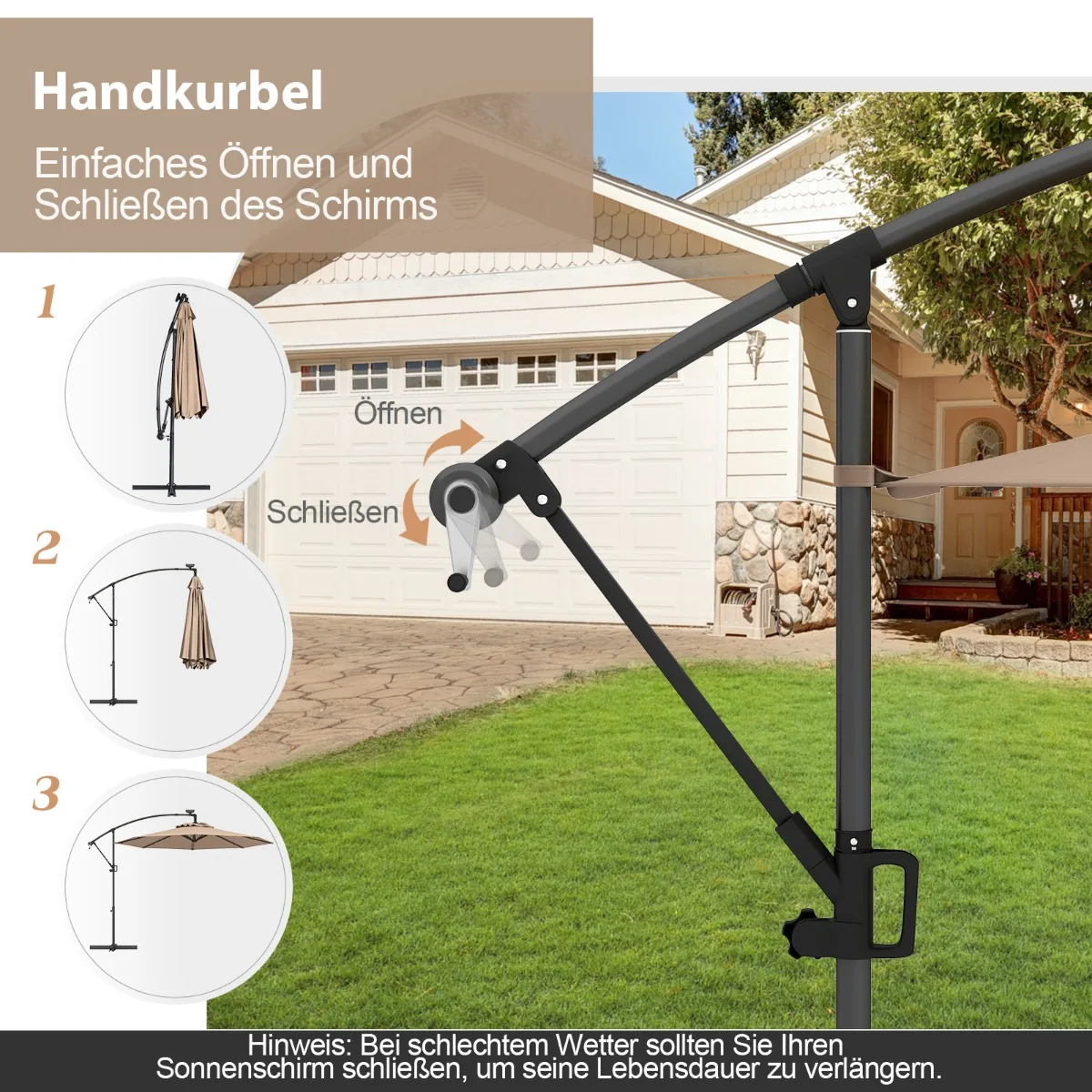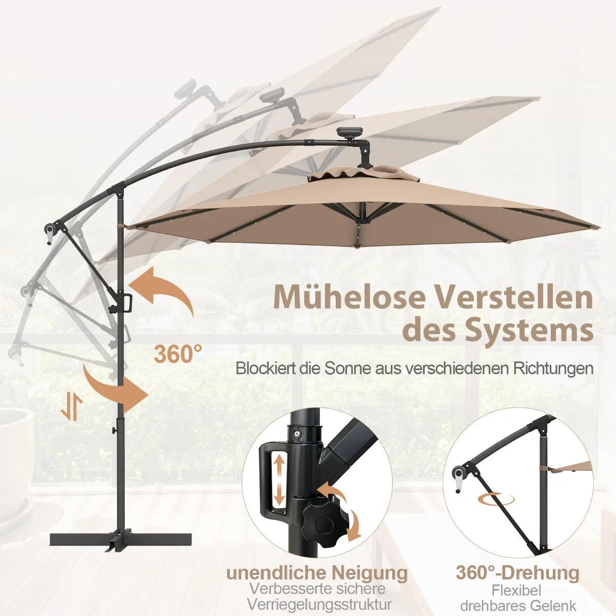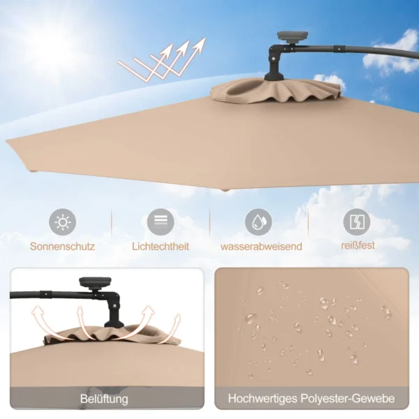 - Reguliuojamas pakreipimo kampas ir 360° pasukimas leidžia tinkamai nukreipti skėtį nuo saulės.