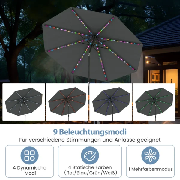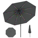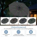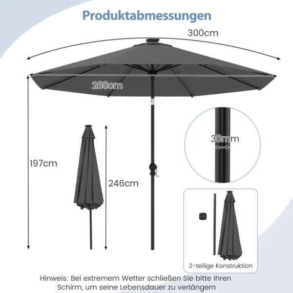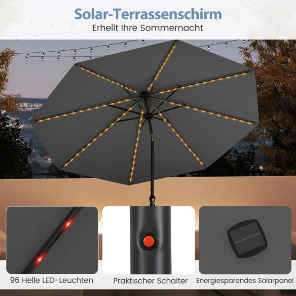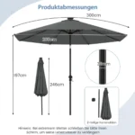 Lauko skėtis 300×246 cm tamsiai pilkos ir juodos spalvos puikiai tinka sodui, terasai ar lauko poilsiui. Skėtis suteikia patikimą apsaugą nuo saulės ir nedidelio lietaus, o 96 saulės energija varomos LED lemputės užtikrina apšvietimą lauke vakaro metu. Reguliuojamas stogelis ir patogi konstrukcija leidžia lengvai pritaikyti šešėlį.