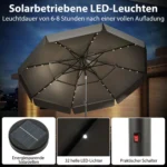 • 32 LED lemputės palei skėčio briaunas, kurių maitinimas vyksta saulės baterijos energija, apšviečia aplinką sutemus.