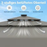 Lauko skėtis 300x248cm pilkos ir juodos spalvos skirtas terasoms, kiemams bei sodams. Saulės energija varomas skėtis užtikrina patogią apsaugą nuo saulės, papildytą LED apšvietimu bei reguliuojamu ventiliuojamu stogeliu, prisitaikančiu prie oro sąlygų.