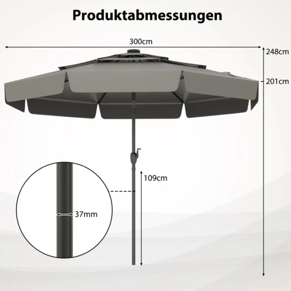 • 300 cm ilgio skėtis su trijų pakopų ventiliuojamu stogeliu geresnei oro cirkuliacijai ir didesniam atsparumui vėjui.