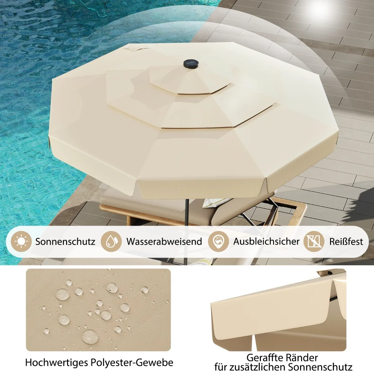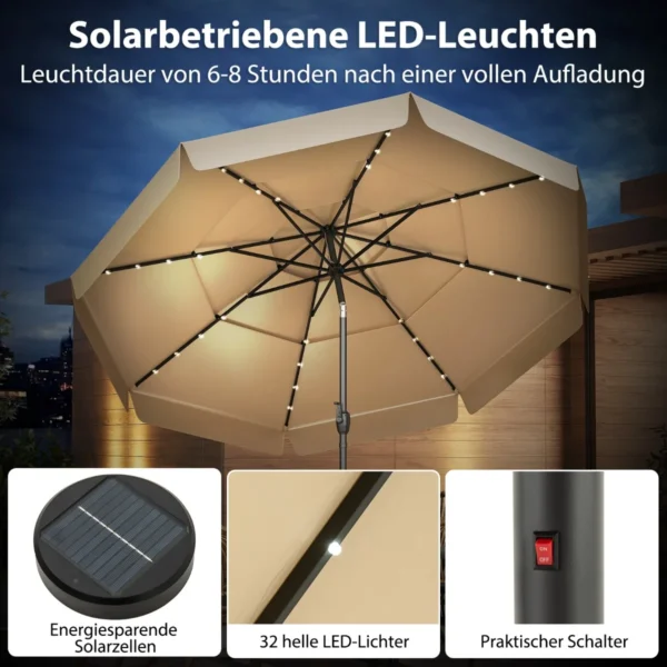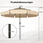 Lauko skėtis 300×248 cm smėlio/juodos spalvos yra skirtas apsaugoti nuo saulės ir lengvo lietaus. Saulės energija maitinamas skėtis turi ventiliuojamą stogelį bei integruotą LED apšvietimą, todėl tinka naudoti tiek dieną, tiek vakare.