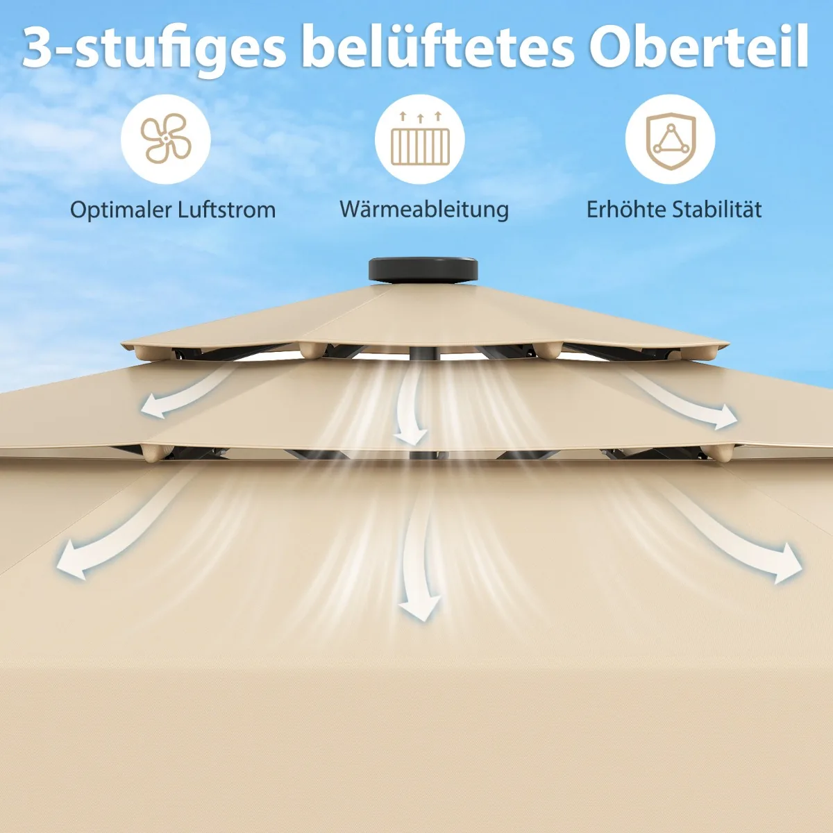 - Skėtis turi trijų pakopų ventiliuojamą stogelį, užtikrinantį optimalią oro cirkuliaciją ir didesnį stabilumą vėjuotomis sąlygomis.