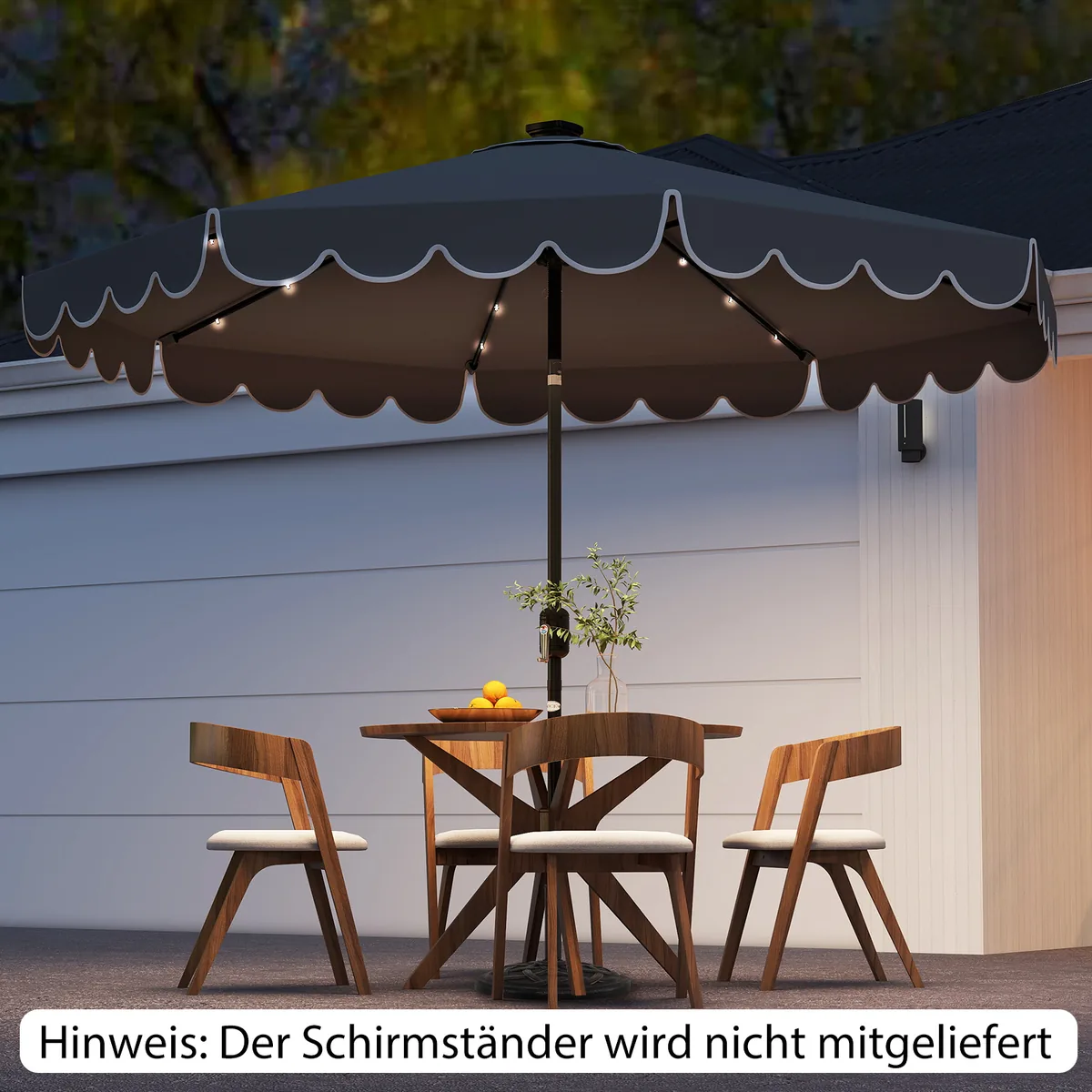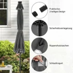 Lauko skėtis 300×253 cm pilkos/juodos spalvos yra skirtas sukurti patogią pavėsinę bet kokioje lauko erdvėje. Tinka naudoti terasoje, sode ar prie baseino, apsaugant nuo saulės ir nedidelio lietaus. Integruotos saulės energiją naudojančios LED lemputės užtikrina švelnią aplinkos šviesą vakare.