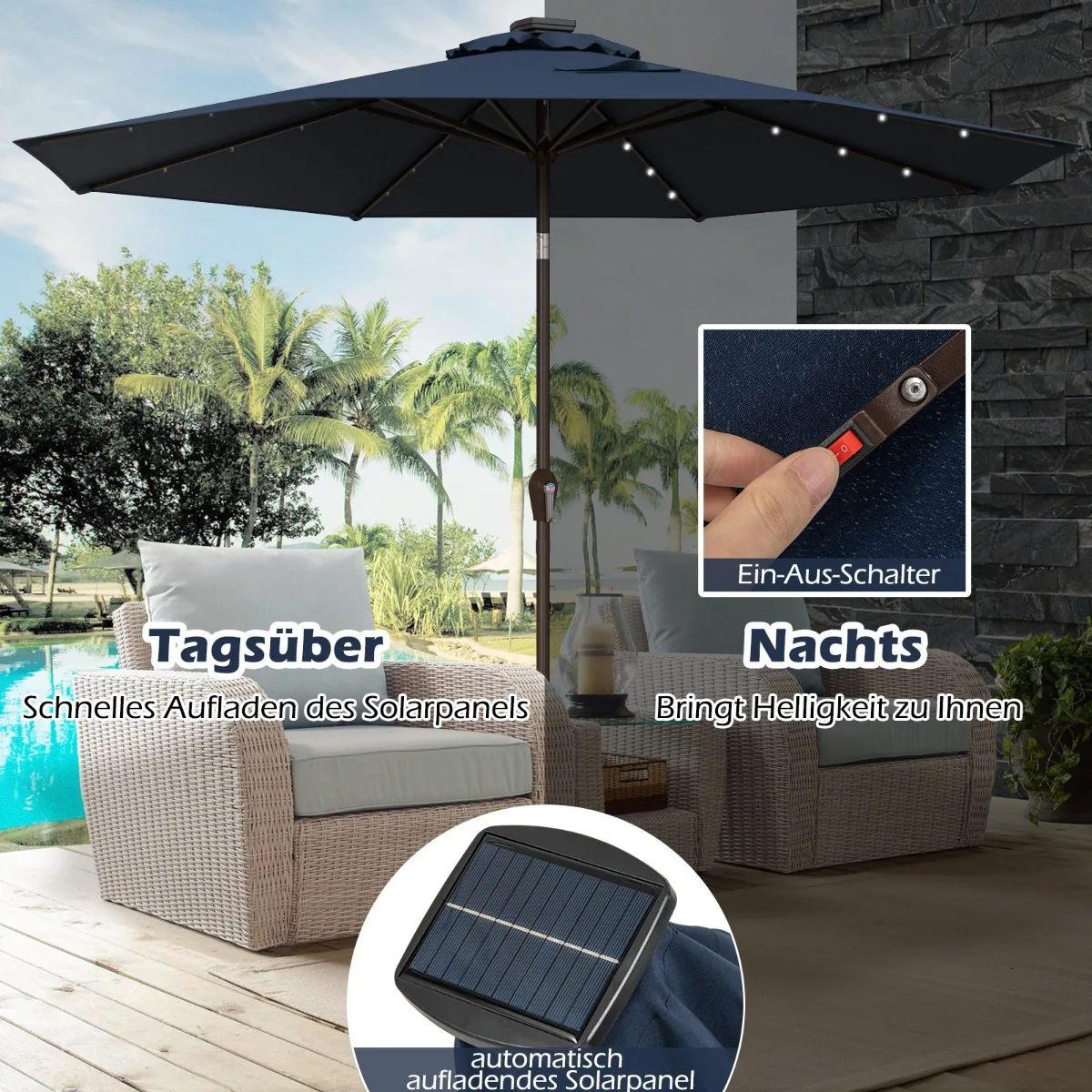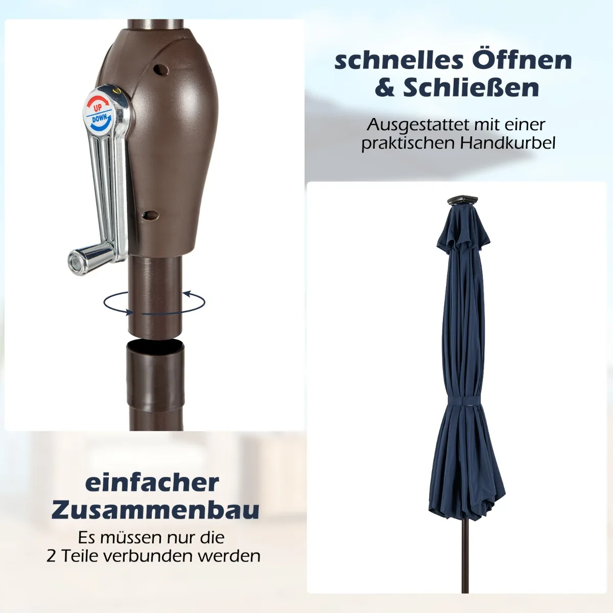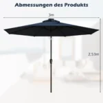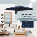 Lauko skėtis 300×253 cm tamsiai mėlynos/juodos spalvos yra praktiškas sprendimas pavėsiui balkonuose, soduose, terasose ar paplūdimiuose sukurti. Jis užtikrina apsaugą nuo saulės spindulių ir yra pritaikytas naudoti tiek dieną, tiek naktį dėl integruotų LED lempučių.