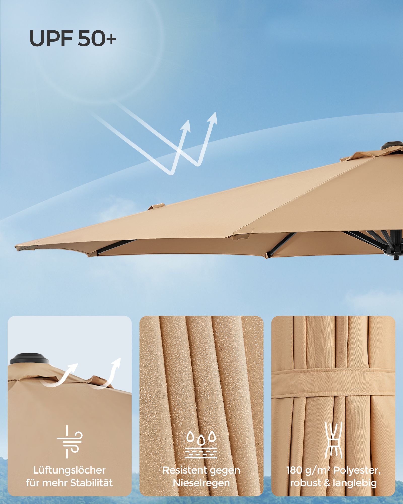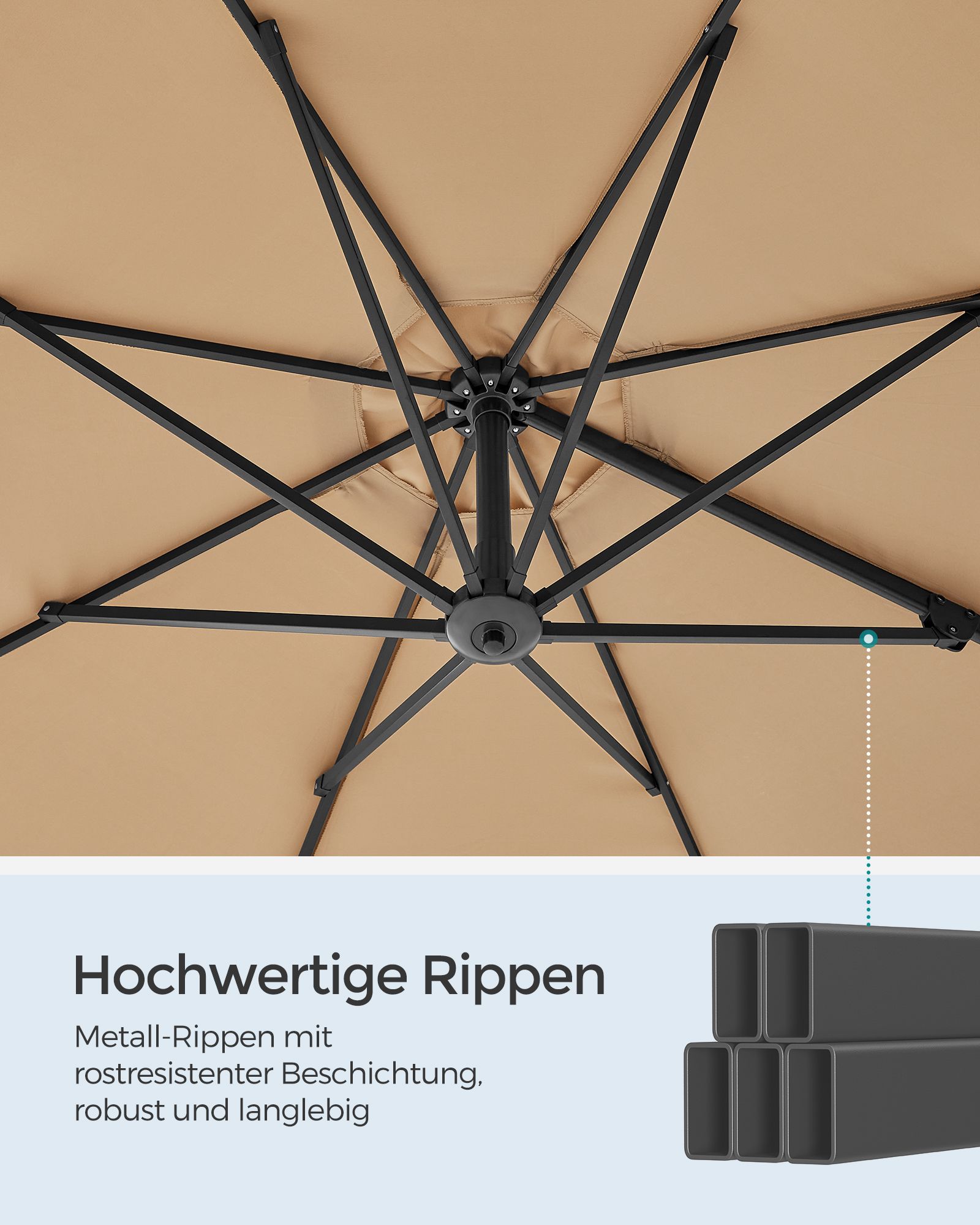 Pagamintas iš tvirto plieno ir 180 g/m² poliesterio, šis skėtis užtikrina ilgaamžiškumą ir atsparumą įvairioms oro sąlygoms. Skėčio audinio dydis yra Ø 300 cm, o bendras aukštis siekia 240 cm. Svoris – 14,8 kg, todėl jis yra stabilus ir lengvai perkeliamas.