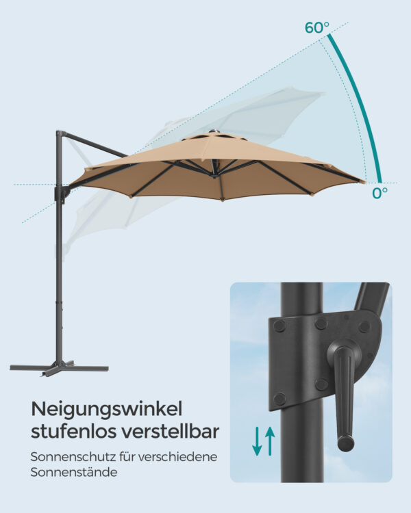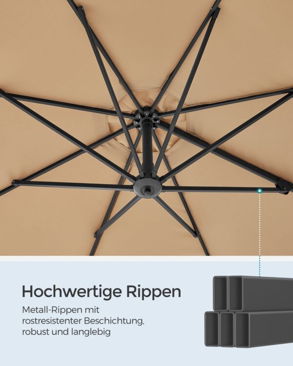 Šis lauko skėtis 300×300 cm, smėlio ir juodos spalvos, yra puikus pasirinkimas jūsų sodo ar terasos apsaugai nuo saulės. Jo elegantiškas dizainas ir kokybiškos medžiagos suteikia stiliaus ir funkcionalumo jūsų lauko erdvei.