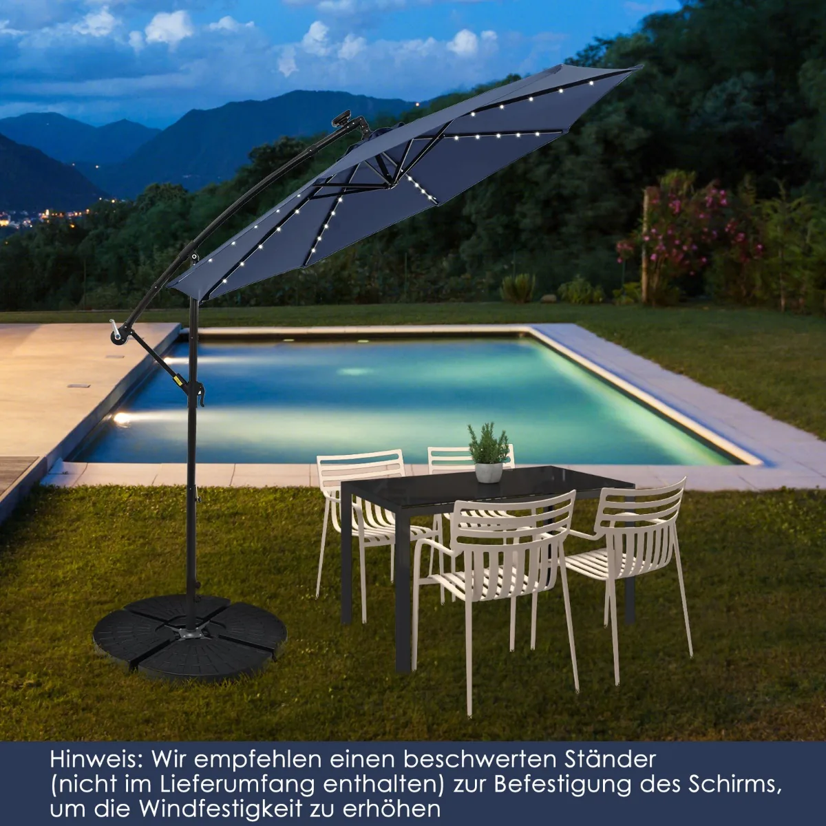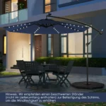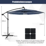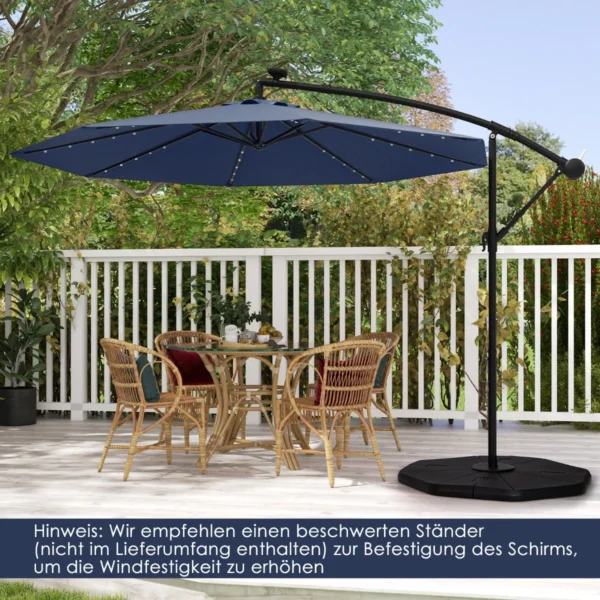 Lauko skėtis 300x300x250 cm, tamsiai mėlynos ir juodos spalvos, suteikia patogų pavėsį jūsų lauko erdvėje. Šis pakabinamas skėtis su saulės baterija užtikrina apsaugą nuo saulės spindulių ir papildomą apšvietimą vakarais. Reguliuojamas pakreipimo kampas leidžia pritaikyti šešėlį pagal saulės padėtį.