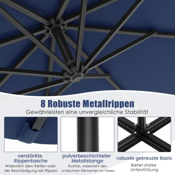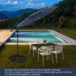 - Skėtis su konsoline konstrukcija 300 x 300 x 250 cm (plotis x ilgis x aukštis), suteikia apie 7 m² pavėsį.