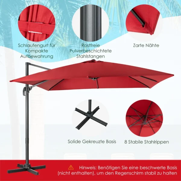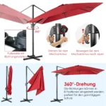 Lauko skėtis 300x300x273 cm, vyno raudonos ir juodos spalvų derinyje, puikiai tinka sodams, terasoms bei kitiems lauko pavėsiams kurti. Skėtis pagamintas iš patvarių medžiagų, užtikrinančių atsparumą vandeniui, ultravioletiniams spinduliams ir rūdims.